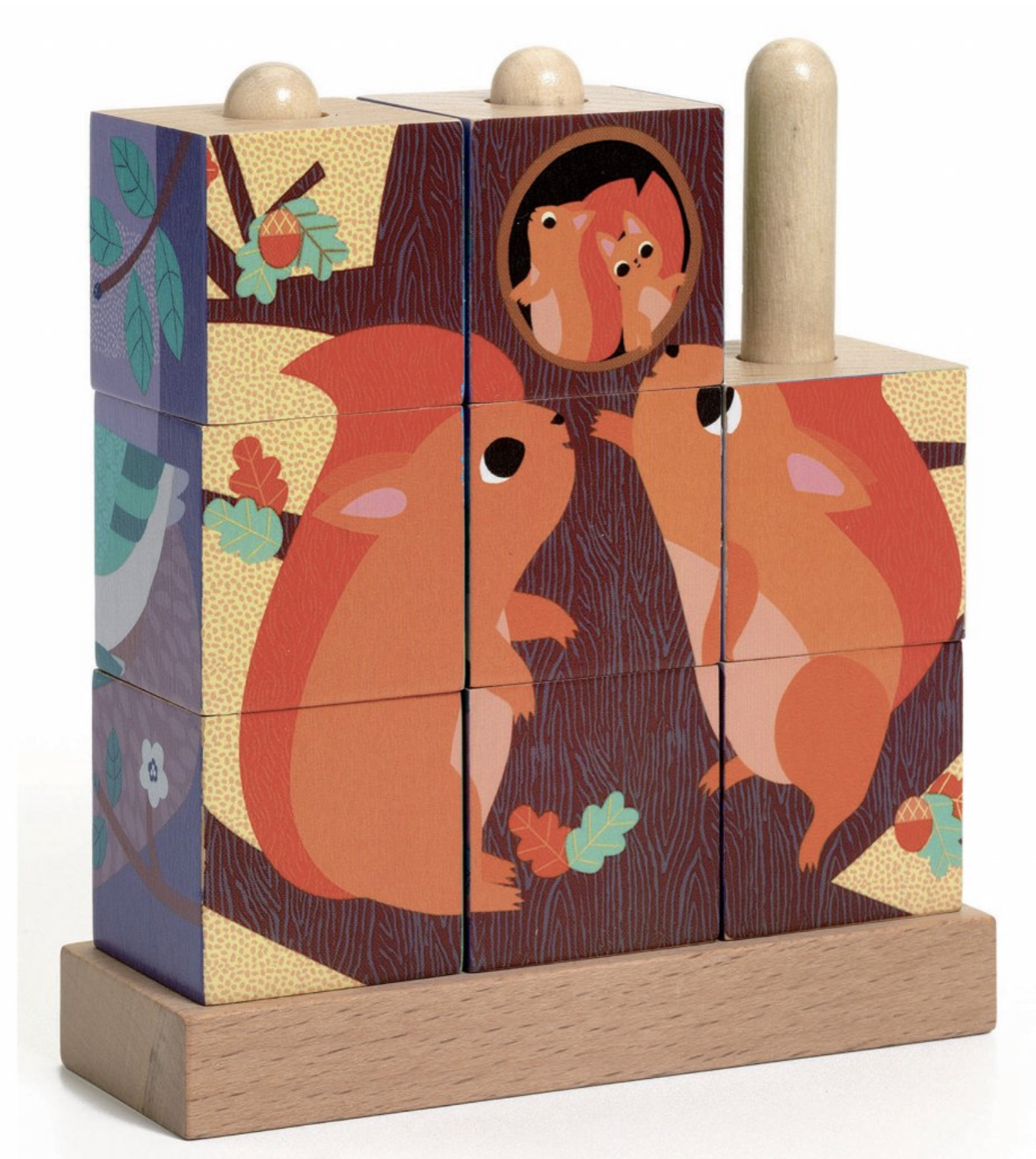 Krásné stohovatelné dřevěné kostky s obrázky lesních zvířátek, které stavíte pomocí dřevěných vodících kolíků na sebe. Děti mohou seskládat čtyři obrázky v krásných ilustracích lesních zvířátek.
