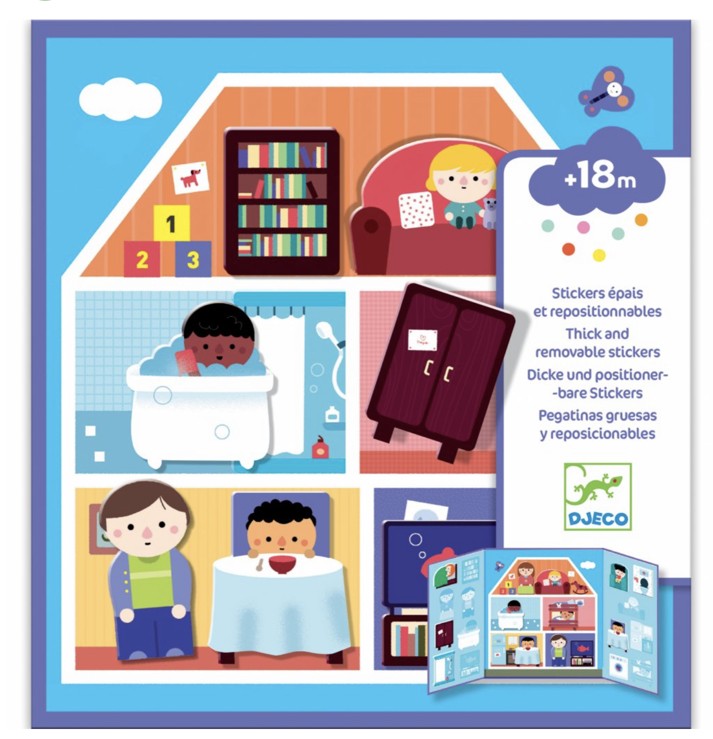 Krásné přemístitelné samolepky pro nejmenší, s kterými si užijete spoustu zábavy! Děti mohou členy rodiny a nábytek umisťovat do domečku a poté hledat správné místo pro konkrétní samolepku podle obrysů. Ideální na cesty.