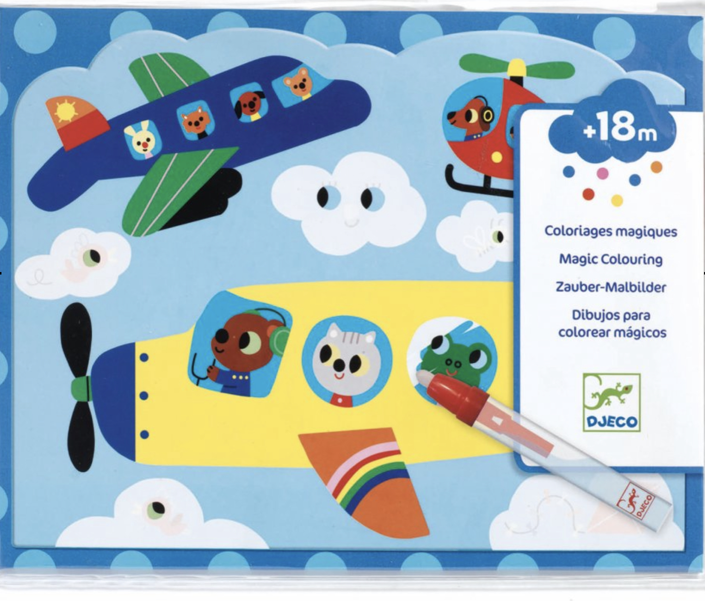 Dopravní prostředky ve vzduchu na 4 obrázcích o velikosti 21 x 26cm se objeví až po přetření magickou tužkou. Tužka se před aplikací naplní vodou, která umožní objevení obrázků v pestrobarevných barvách. Krásně barevný obrázek zůstane odkrýtý dokud všechna aplikovaná voda nevyschne. Po vyschnutí se opět obrázek zahalí do bílé, neprůhledné barvy a děti mohou znovu odkrývat. Nikdy nekončící zábava bude děti bavit a zaměstná je na dlouhých i krátkých cestách. Vše zabalené v praktickém obalu se zapínáním, aby se i na cestách nic neztratilo a děti mohly přes průhledný obal pozorovat postupně měnící se obrázek. Pro děti od 18 měsíců. Sada obsahuje 4 obrázky, magickou tužku, hadřík. Rozměry balení 31,5 x 22 x 1,5cm.