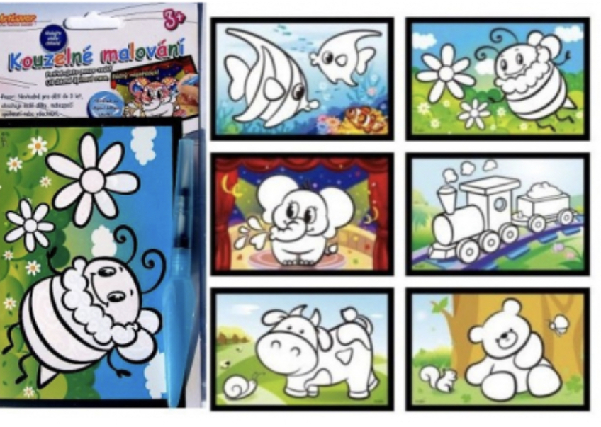 Kouzelné malování - 1 obrázek Malování "KOUZELNÝM ŠTĚTCEM". Tento štětec pouze naplníte vodou a již můžete malovat obrázek. Díky vodě se vám vybarví. Po zaschnutí obrázek zmizí. Můžete tedy malovat stále dokola..... Vhodné pro děti od 3let.